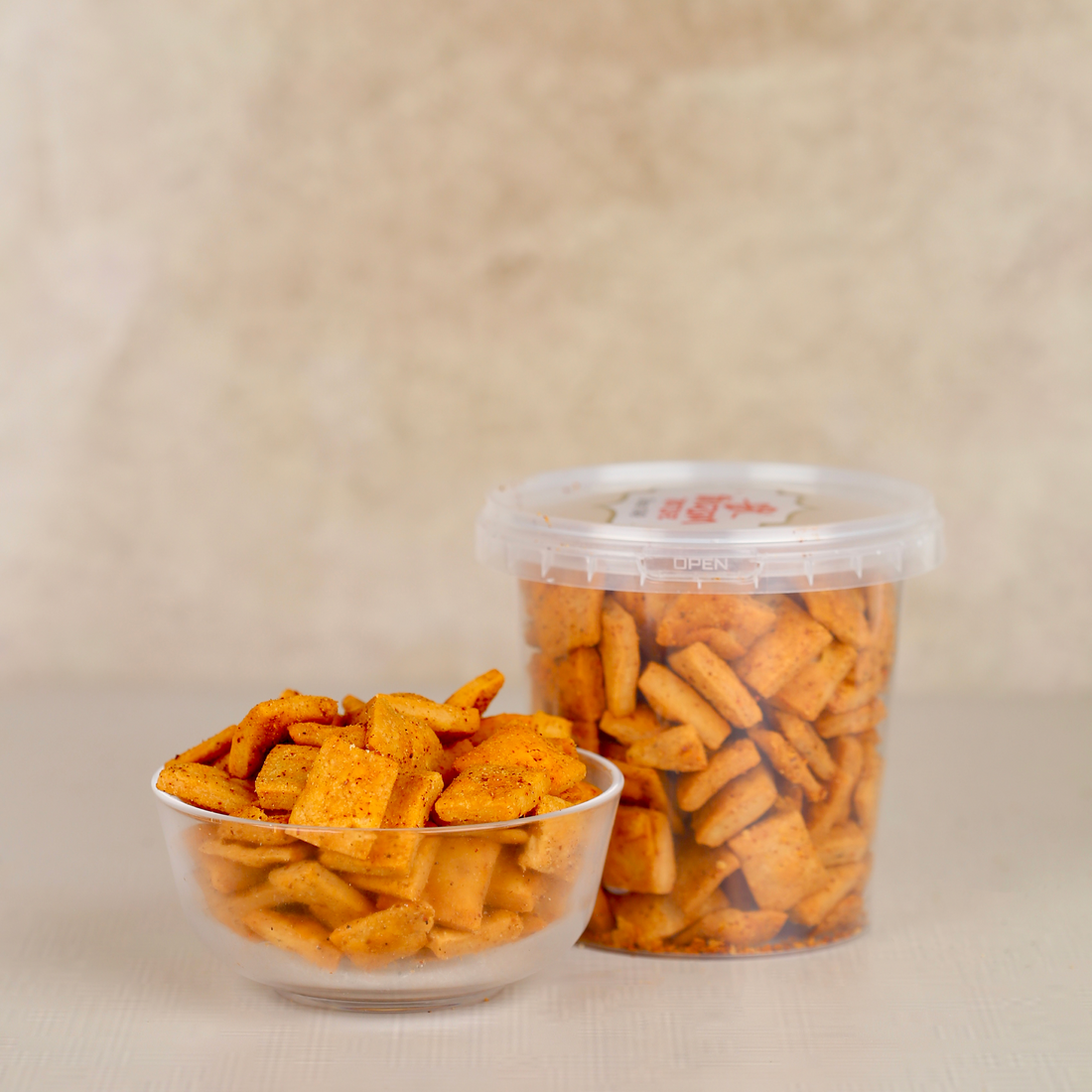 Crisp, bite-sized square pieces, lightly spiced and made with pure groundnut oil. Perfect for snacking...